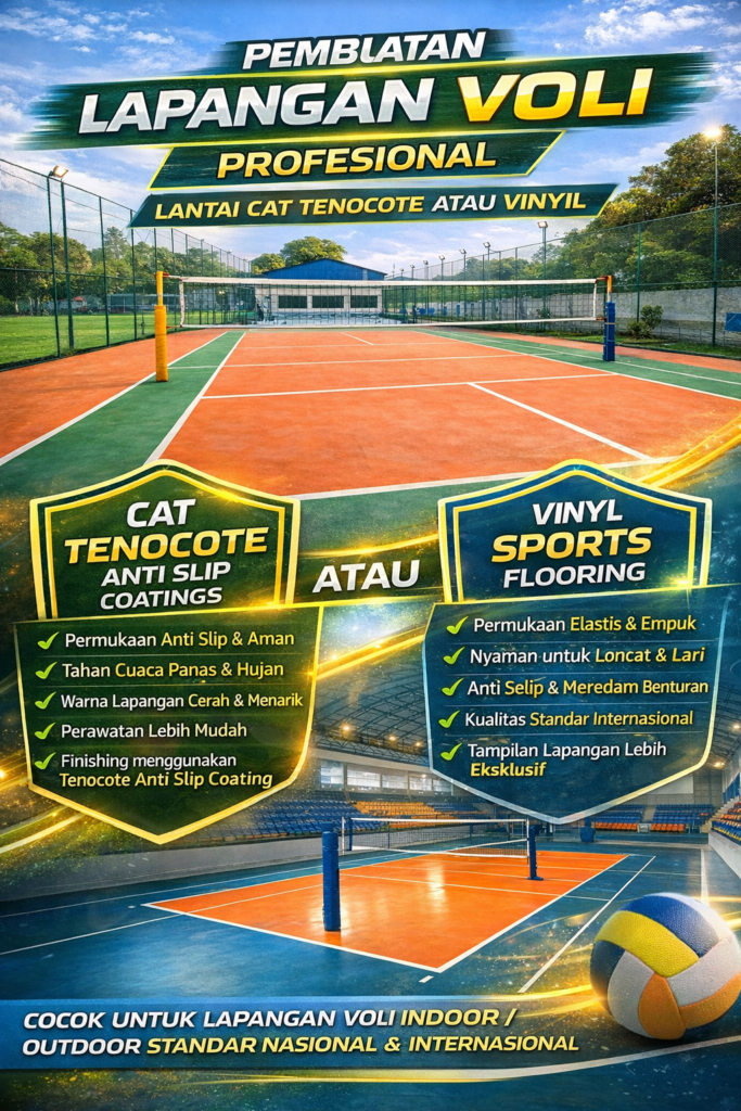 Lapangan voli yang berkualitas tidak hanya bergantung pada ukuran lapangan, tetapi juga pada pemilihan material lantai yang tepat. Oleh karena itu kami menyediakan dua pilihan sistem lantai olahraga yang populer digunakan pada lapangan voli modern, yaitu cat Tenocote anti slip dan lantai vinyl sports flooring.